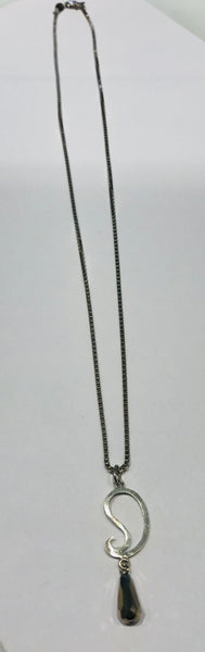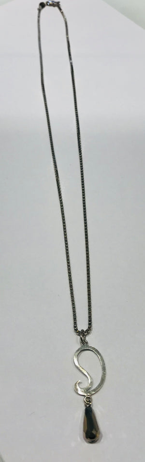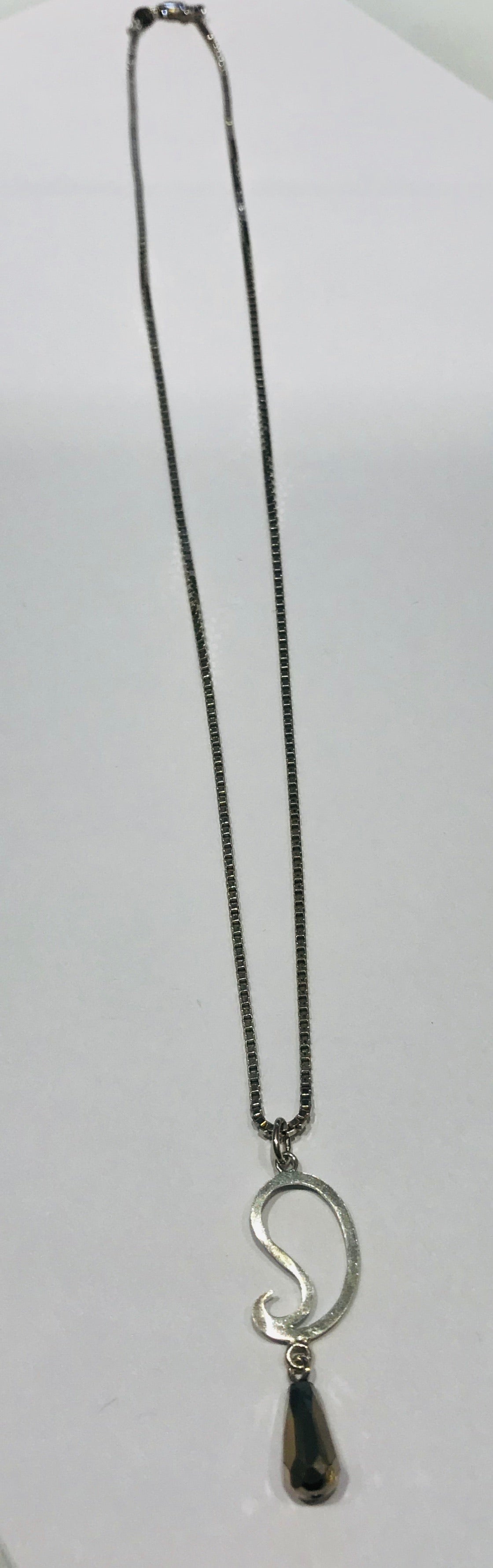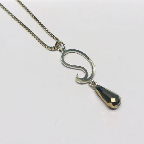 This very elegant long Sterling silver necklace is handmade In Antwerp. The pendant has the shape of a comma with a faceted pyrite stone.