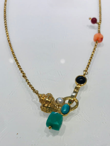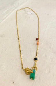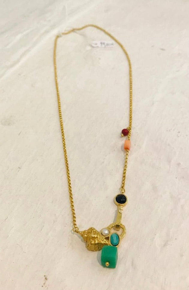 Beautiful goldplated silver necklace with goldplated seashell and semiprecious stones.