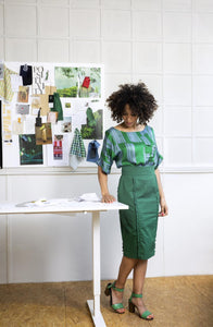 Pencil skirt in green with ruffled details, by the sustainable Belgian brand FAM the label.