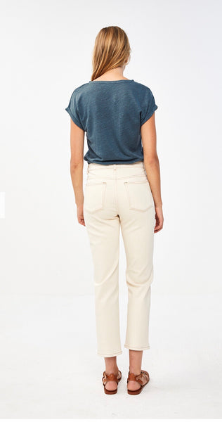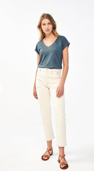 De mila top linen is vervaardigd uit een mooie kwaliteit linnen. De top heeft een kleine kapmouw, is licht gemêleerd en is voorzien van een vrouwelijke doch sportieve v-halslijn.