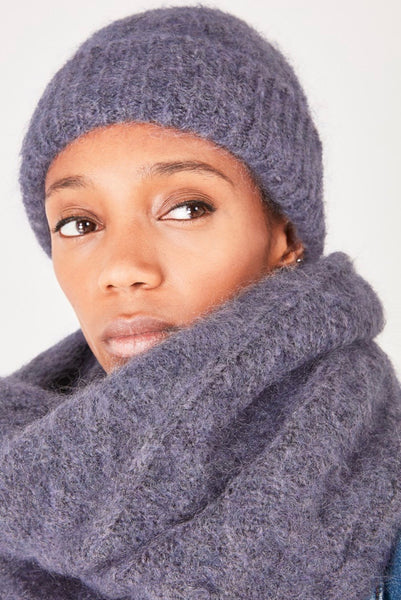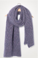 This beautiful cable knitted scarf is very soft and has a subtle purple melange color.