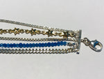This beautiful bracelet is handmade in Antwerp. It has five different chains whereby one with little blue semiprecious stones en one with goldplated stars.