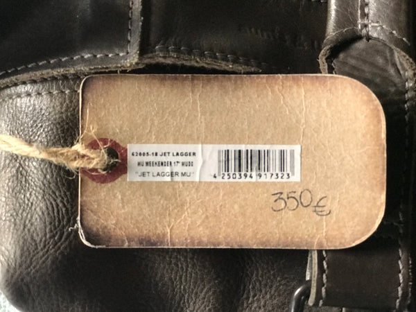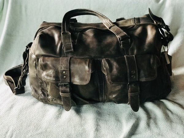 This weekend Bag in high quality leather has two pockets in the front and a removable long strap.