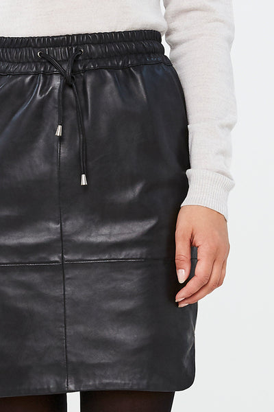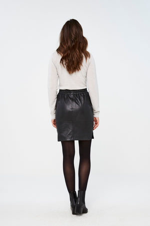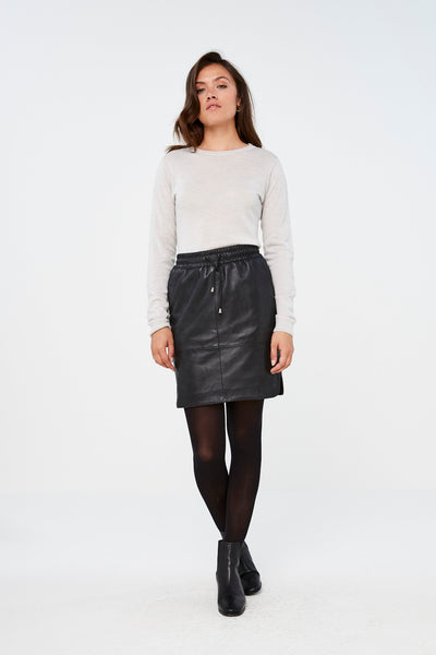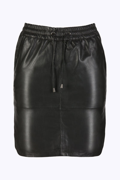 De basic sport skirt is vervaardigd uit 100% zacht leer. De rok heeft twee steekzakken aan de voorzijde en is voorzien van een elastieken tailleband met een leren veter. De rok sluit aan op de heupen.