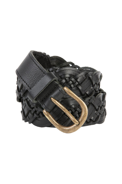 De braided leather belt is gemaakt van soepel buffel leer. De gevlochten riem heeft een bronskleurige sluiting. De riem heeft een lengte van 85 cm in maat s.