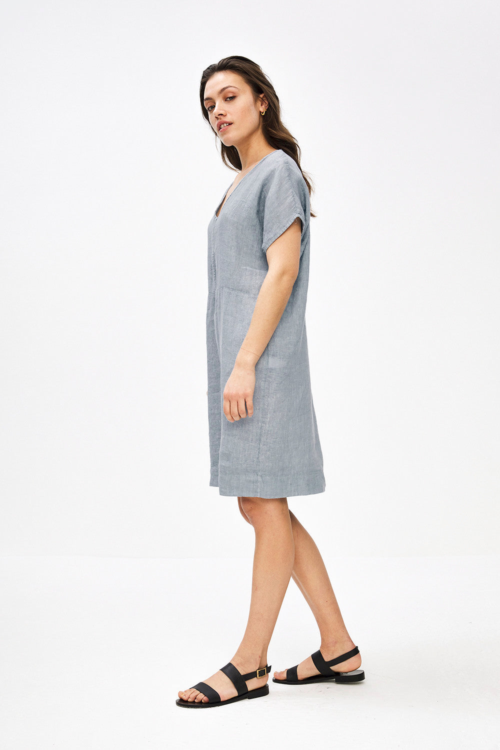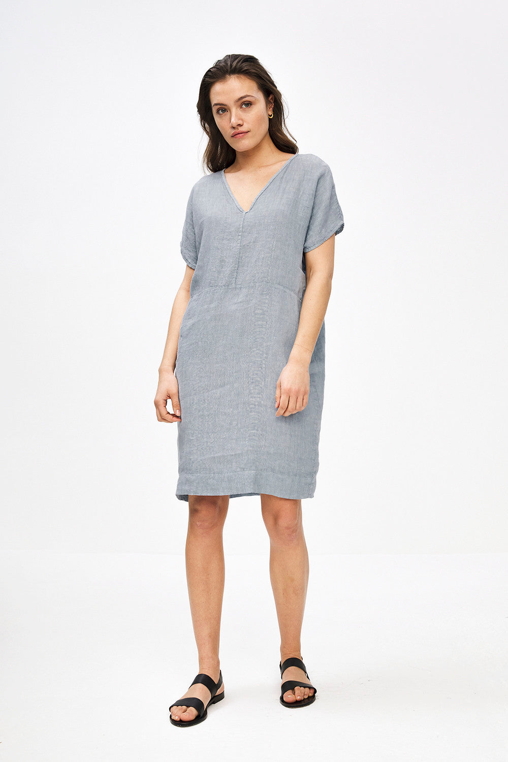 The gitta linen dress is made of good linen quality. This airy dress has a loose-fit model and bat sleeves. The deep v-neck gives the dress a feminine effect. The horizontal stitching on the front gives the dress that little something extra.
