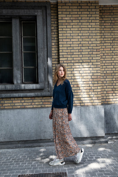 We love this print! Hoe mooi is deze rok. Je combineert 'm met de gaby sunflower blouse en een toffe laars voor een prachtige look. Voor een comfy, maar ook feminine outfit draag je de rok in combinatie met de een leuke pullover.