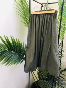 Relaxed khaki skirt with side pockets and elastic waist, very comfortable and perfect for summer. The length of the skirt is just over the knee.