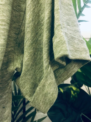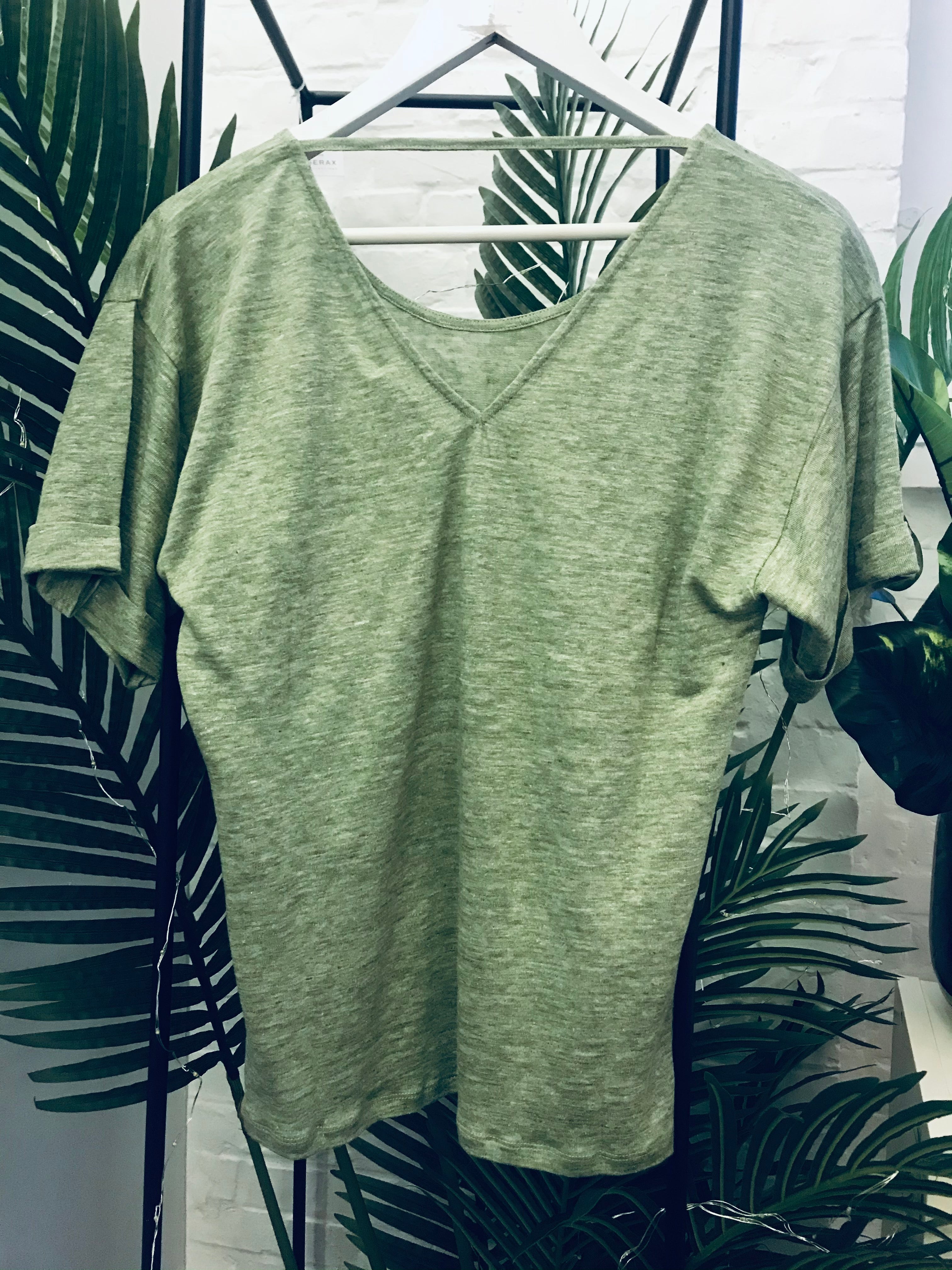 Comfy loose T-shirt with round neck in the front and V in the back. Short wide sleeves.