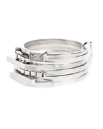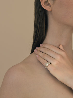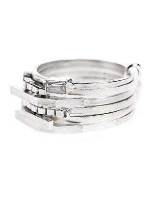 This stacked ring features a combination of different sized elements. The clear mountain crystal detail adds a refined touch. Each piece is designed and handcrafted in Lore Van Keer's atelier in Belgium.