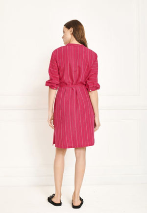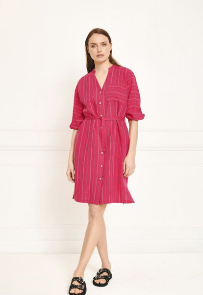 Create a casual look with the rouli fushia striped shirt dress. It suits every silhouettes and it has been designed in a soft and light fabric. 3/4 sleeves, small chest pocket and extra waist belt.