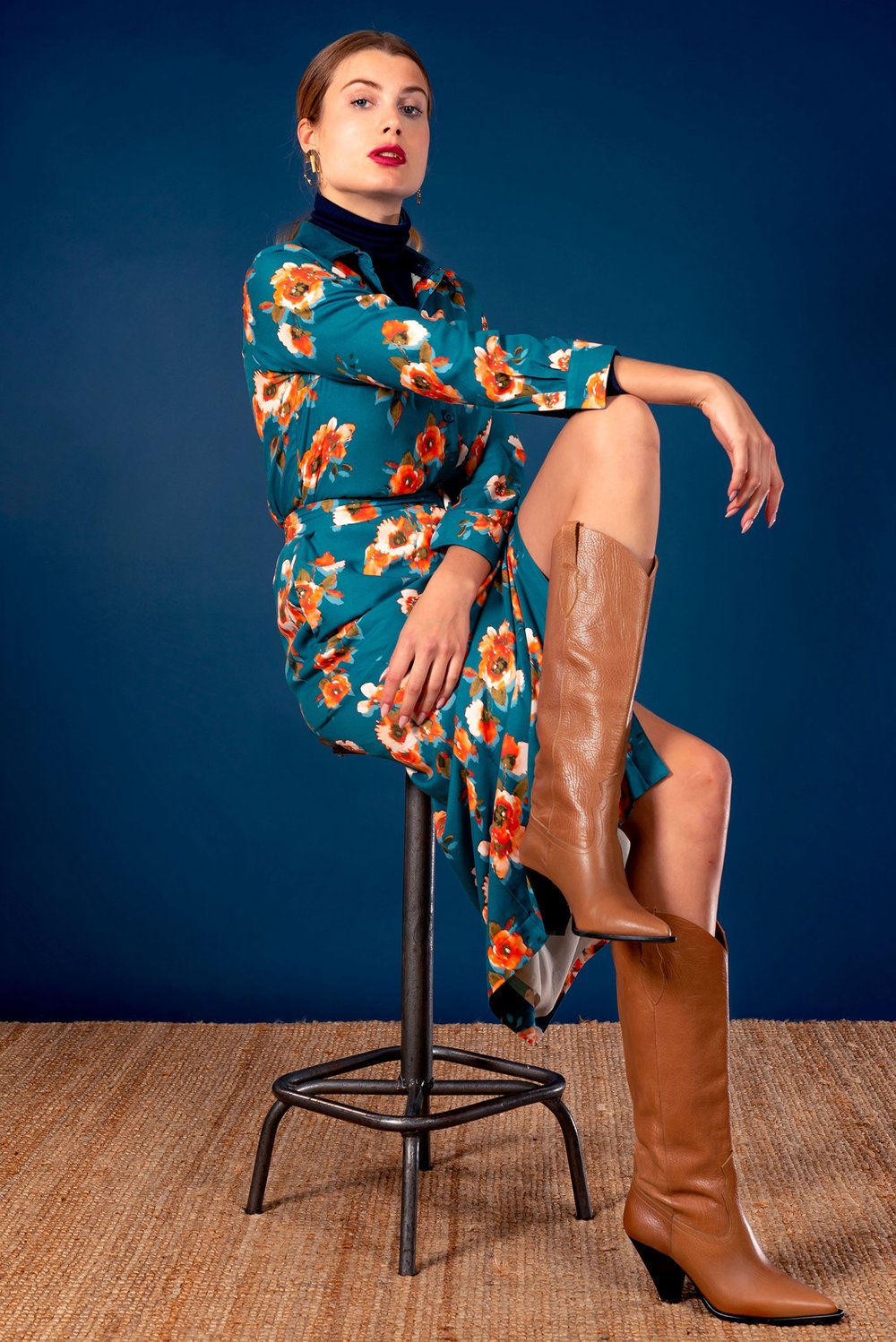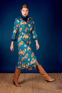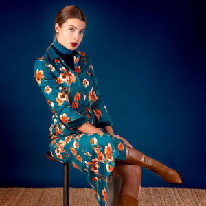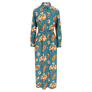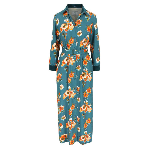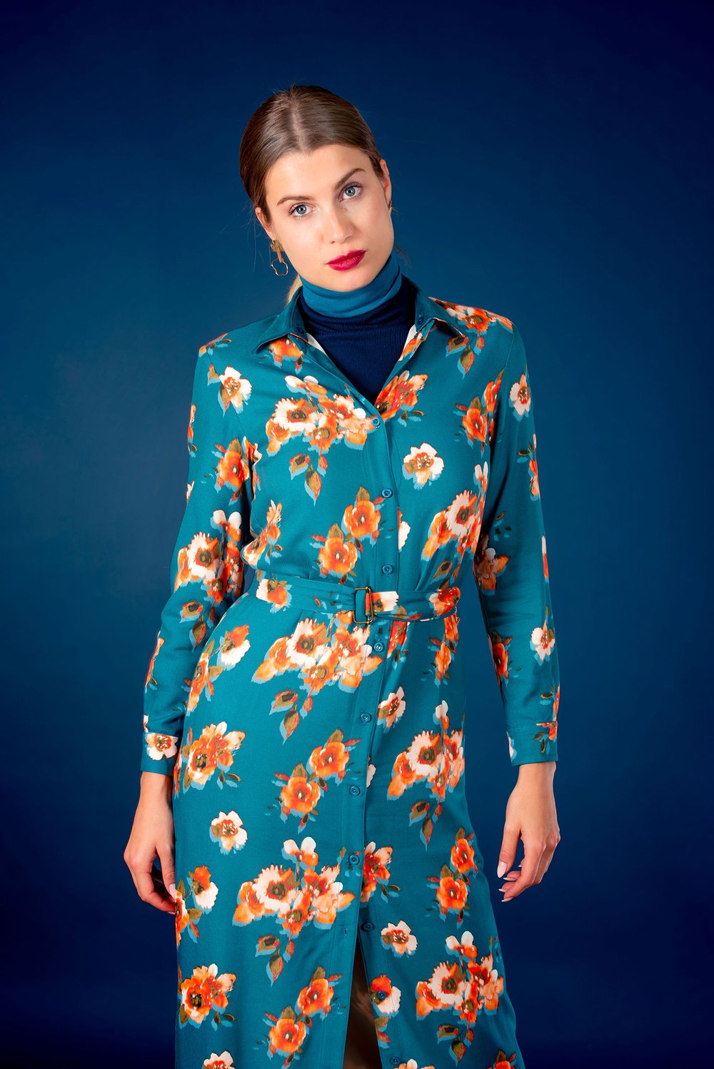 Elegant long button down dress with a belt, pockets in the side seams and a reversible and removable collar. The dress can also be worn open as a coat. The back of the collar is in petrol velours.