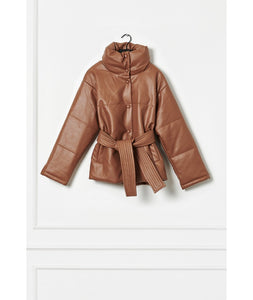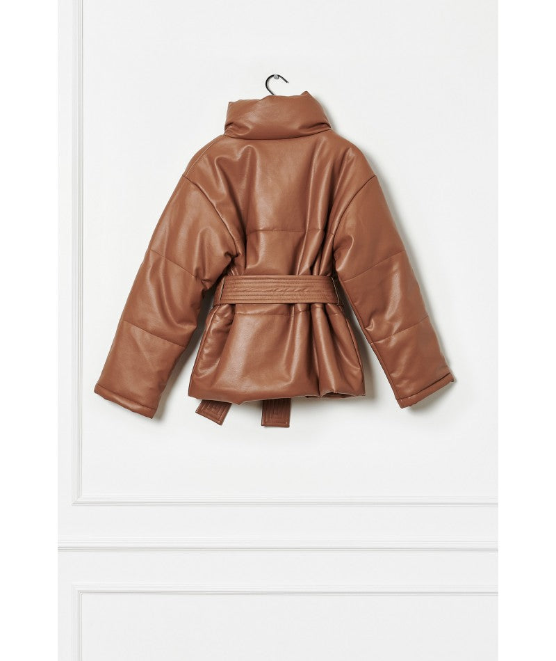 Belted down camel coat in vegan leather.