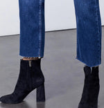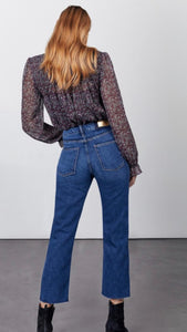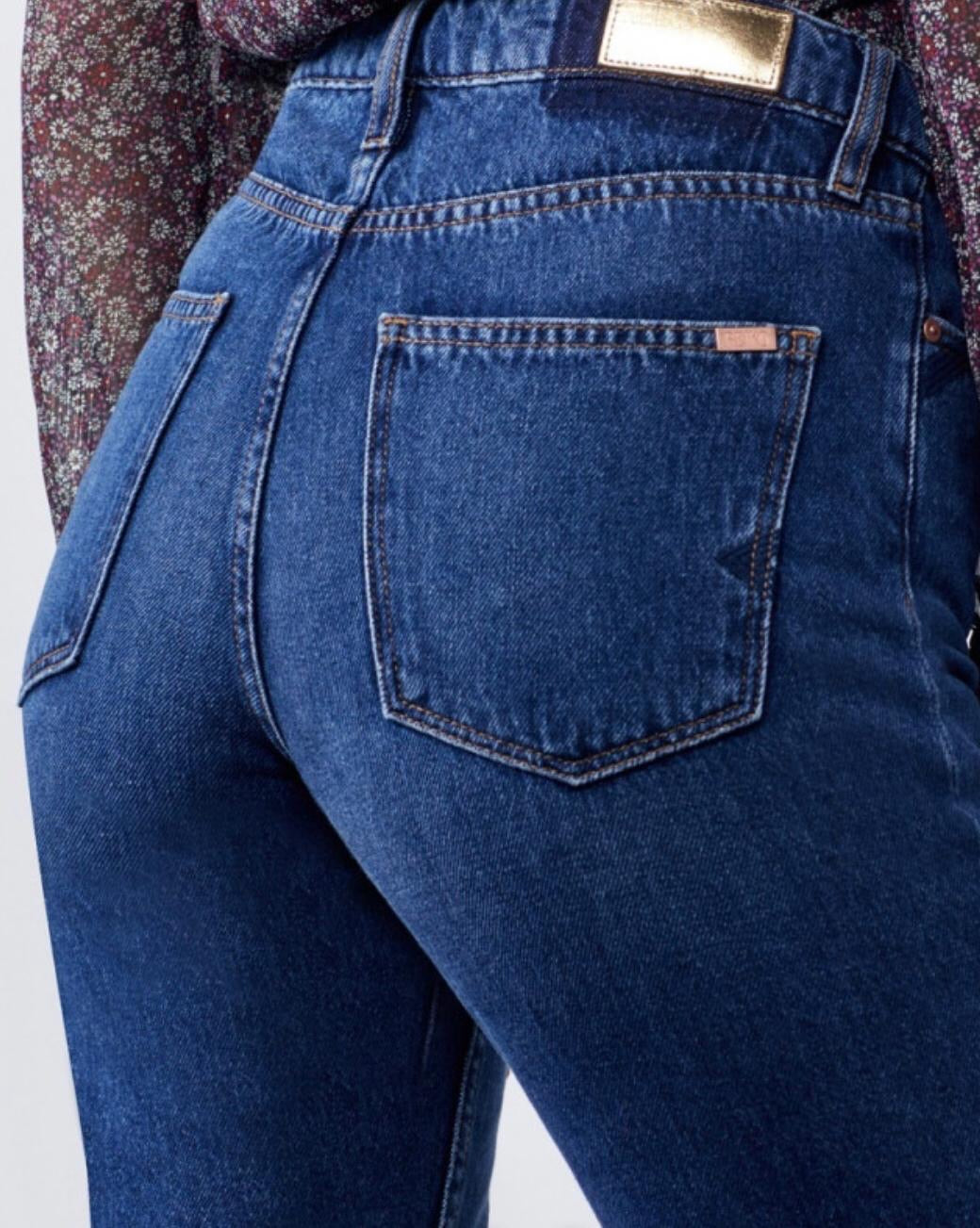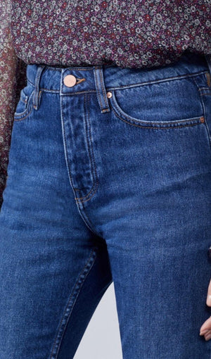 Straight high waist jeans, cropped, with copper details and vintage look.