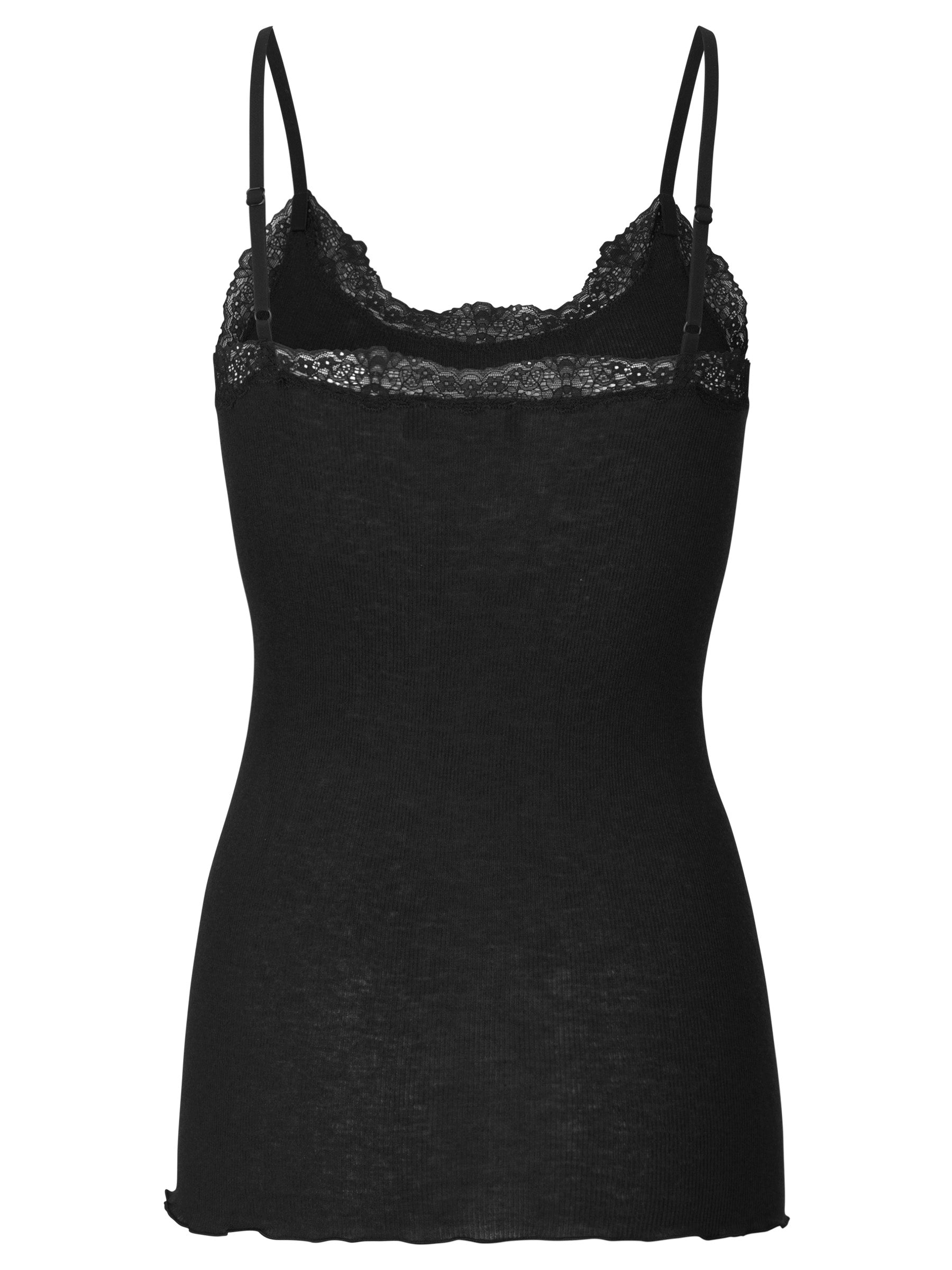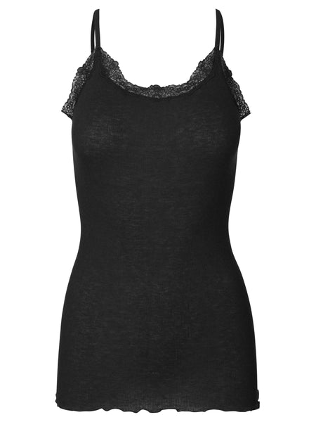 Very comfortable wool strap black top. The lace top is feminine and very comfortable to wear with a cardigan or shirt.