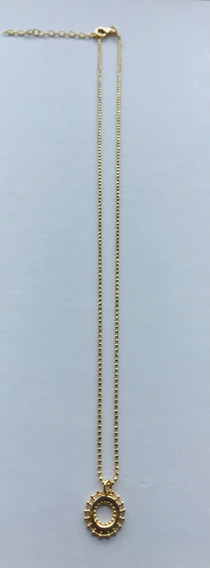 This elegant goldplated Sterling silver necklace has a subtle chain and a carved circle pendant.