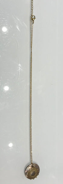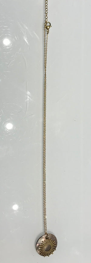 This elegant goldplated silver necklace has a beautiful circle pendant in mother of pearl and a goldplated star.
