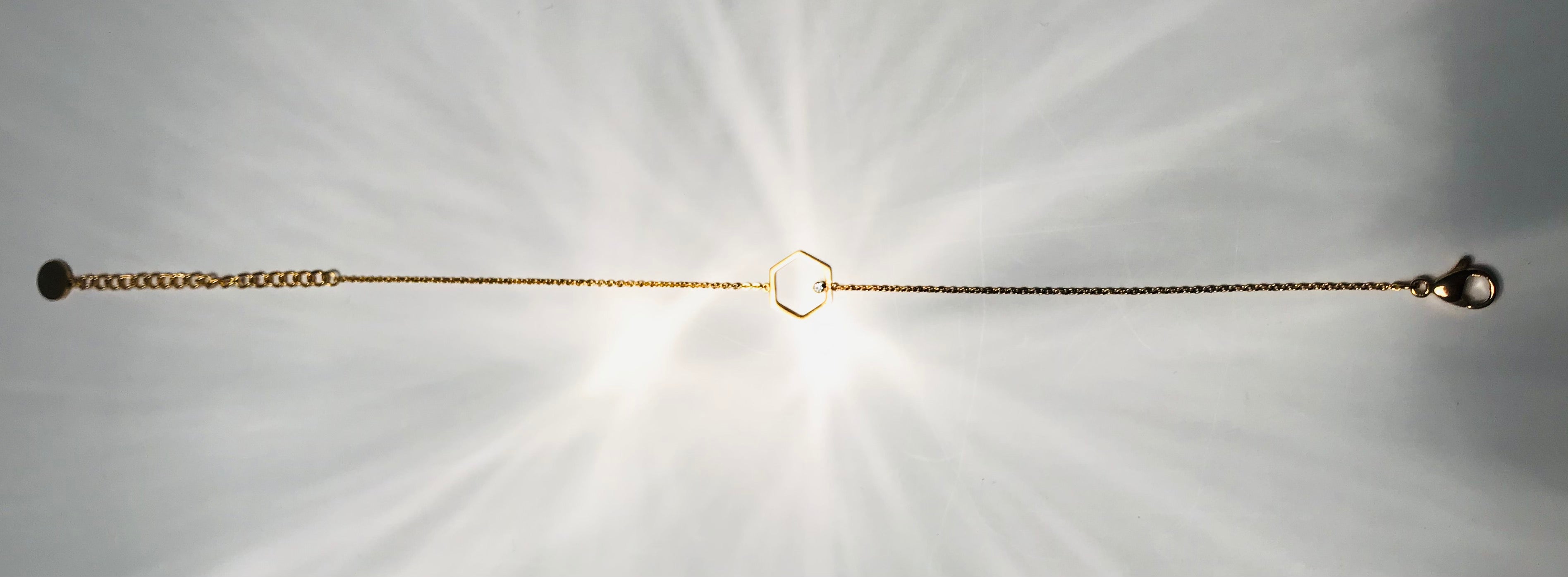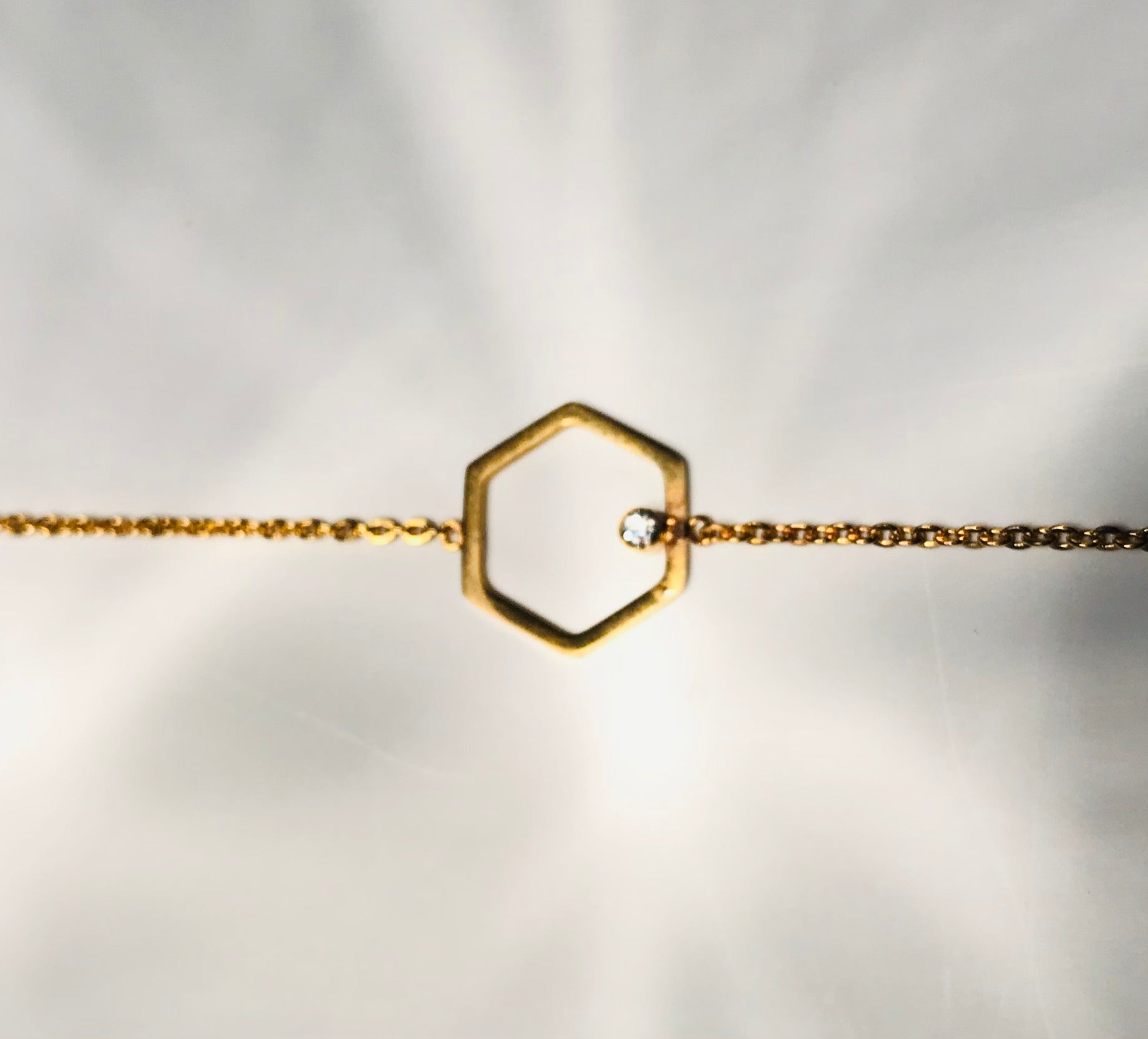 This elegant goldcolored steel bracelet has an open hexagon in the middle with a little zirconium.