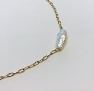 Steel necklace with freshwater pearl and necklace extender to long lengths. Necklace by SAM&CEL.