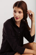 Lenore black tencel dress by Wearable Stories. Cut to be fitted at the bust, loose at the hip. Mid-weight, non-stretchy fabric with breast pockets and side pockets.