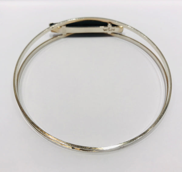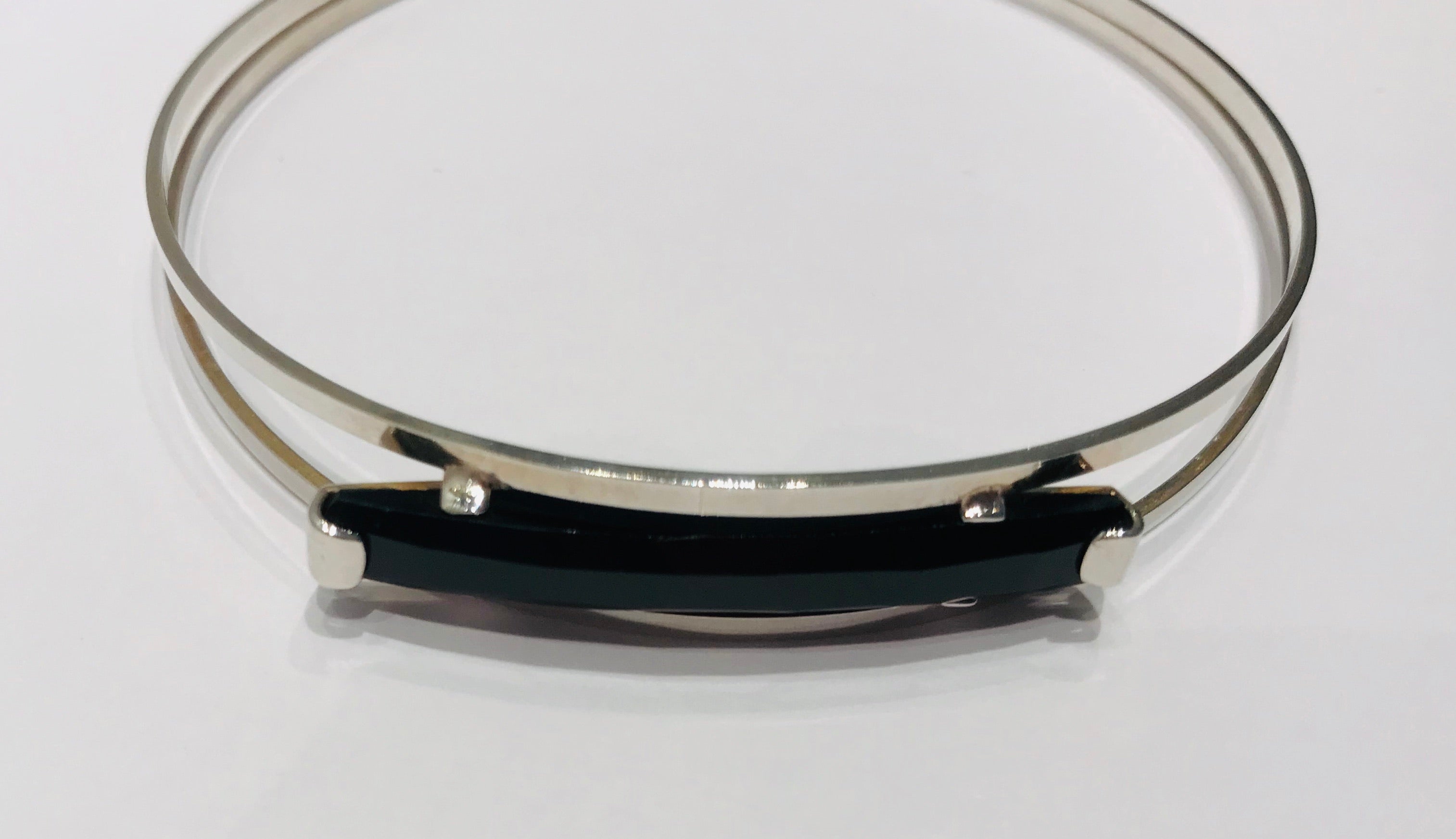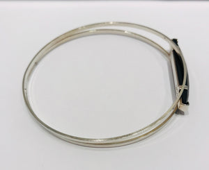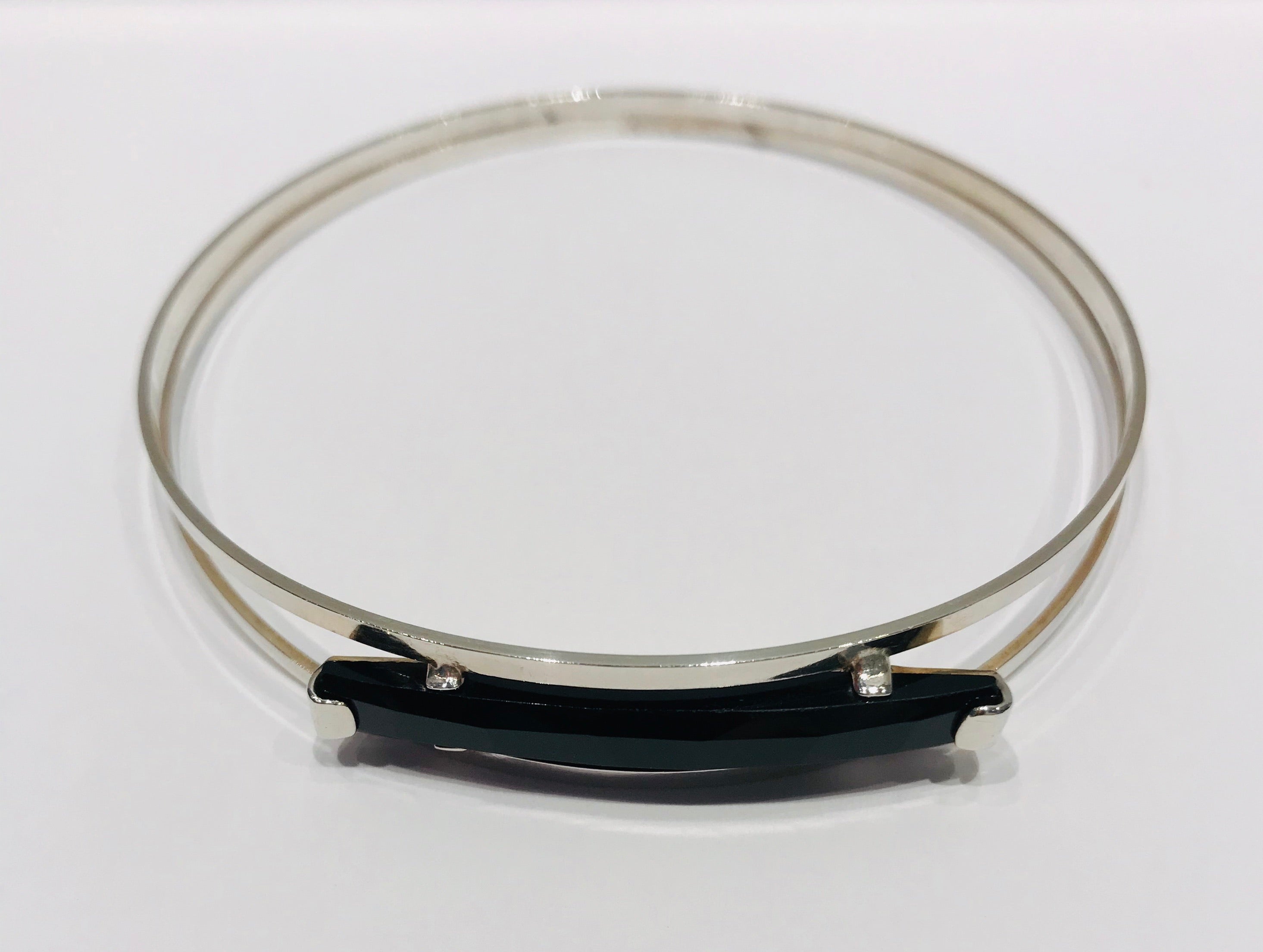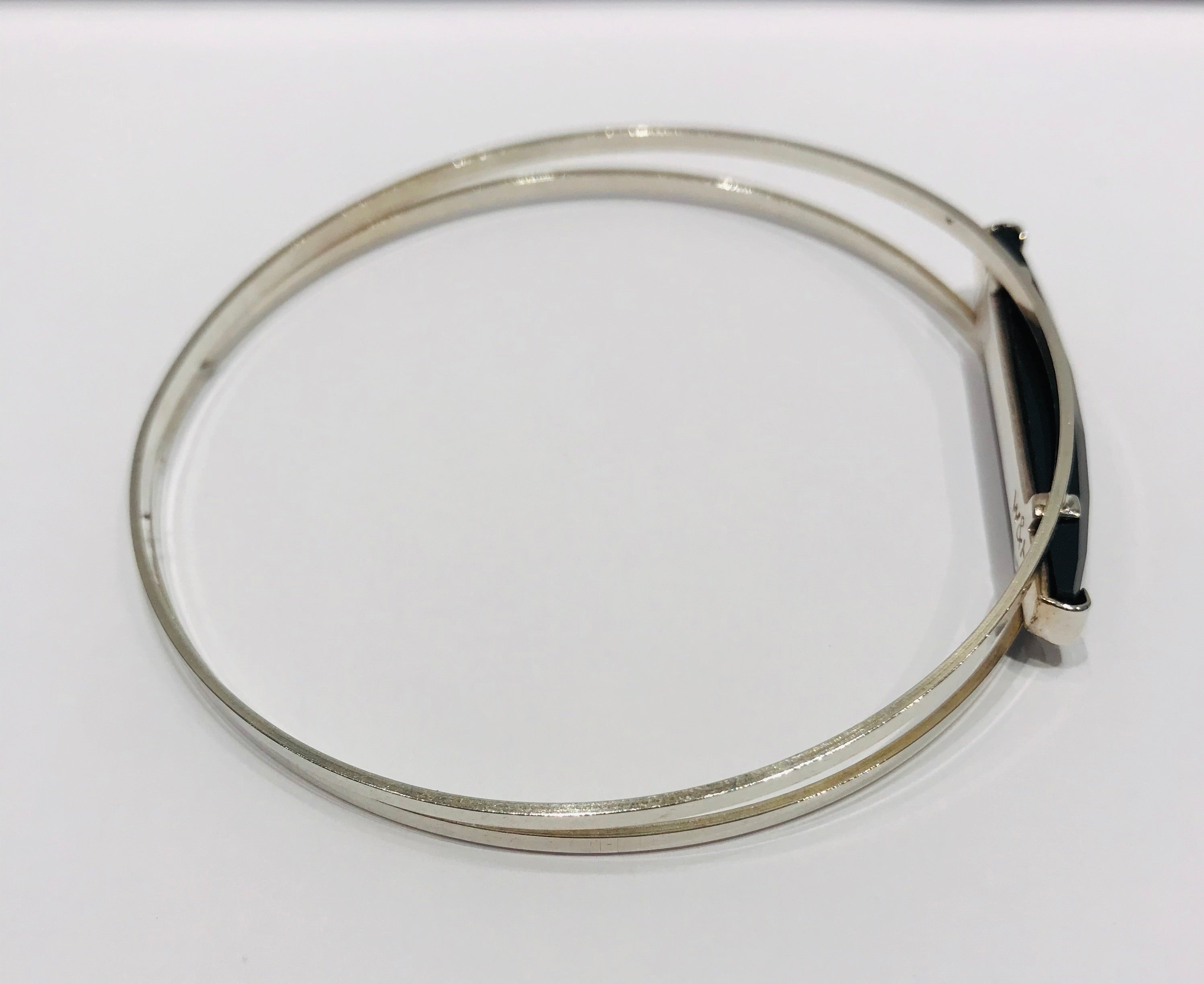 This rigid Sterling silver bracelet exists of two identical sides that are clamping a long faceted black onyx stone.