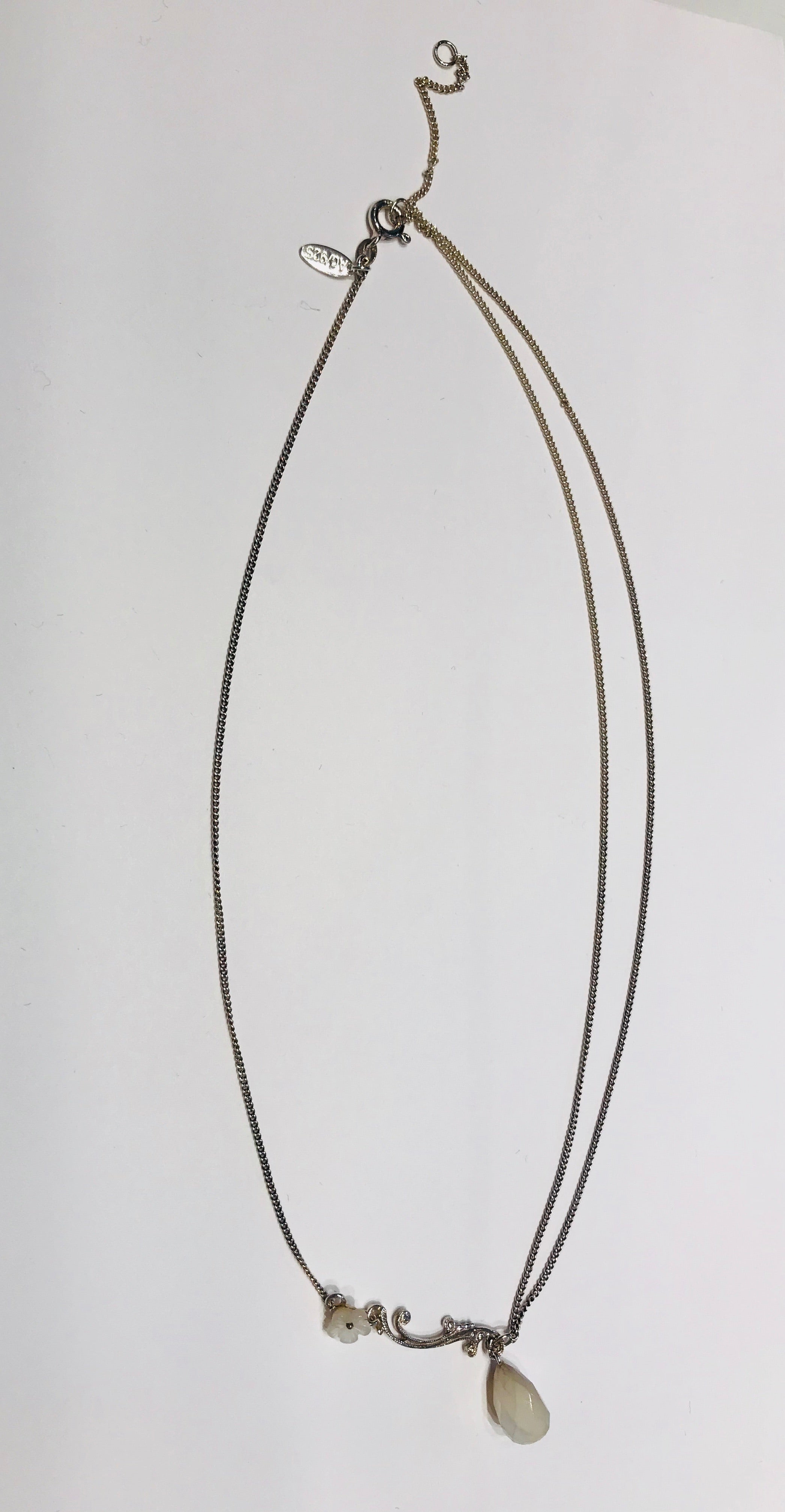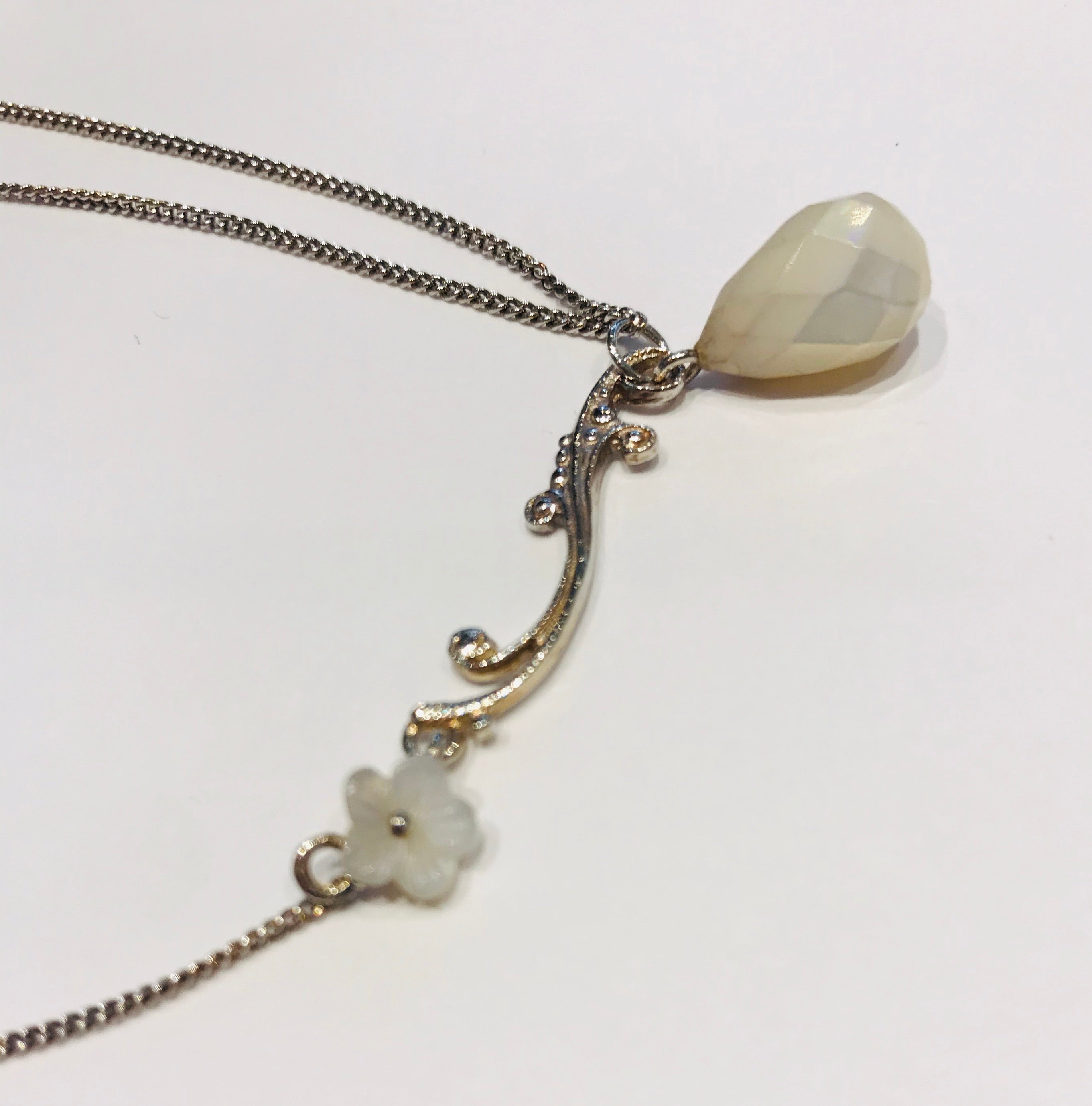 This elegant necklace has a beautiful crafted Sterling silver piece and a delicate mother of pearl white flower. The faceted drop also in mother of pearl gives the necklace its glow.