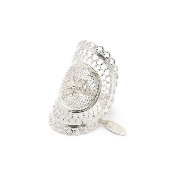The filigree design of this Wouters & Hendrix ring gives it a romantic yet statement look. Wear this ring on its own for maximum effect.DETAILSBase material: Sterling Silver 925Width: 3.2cmWeight: 5.5g