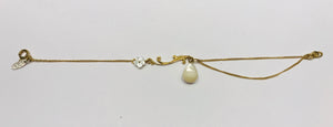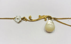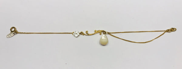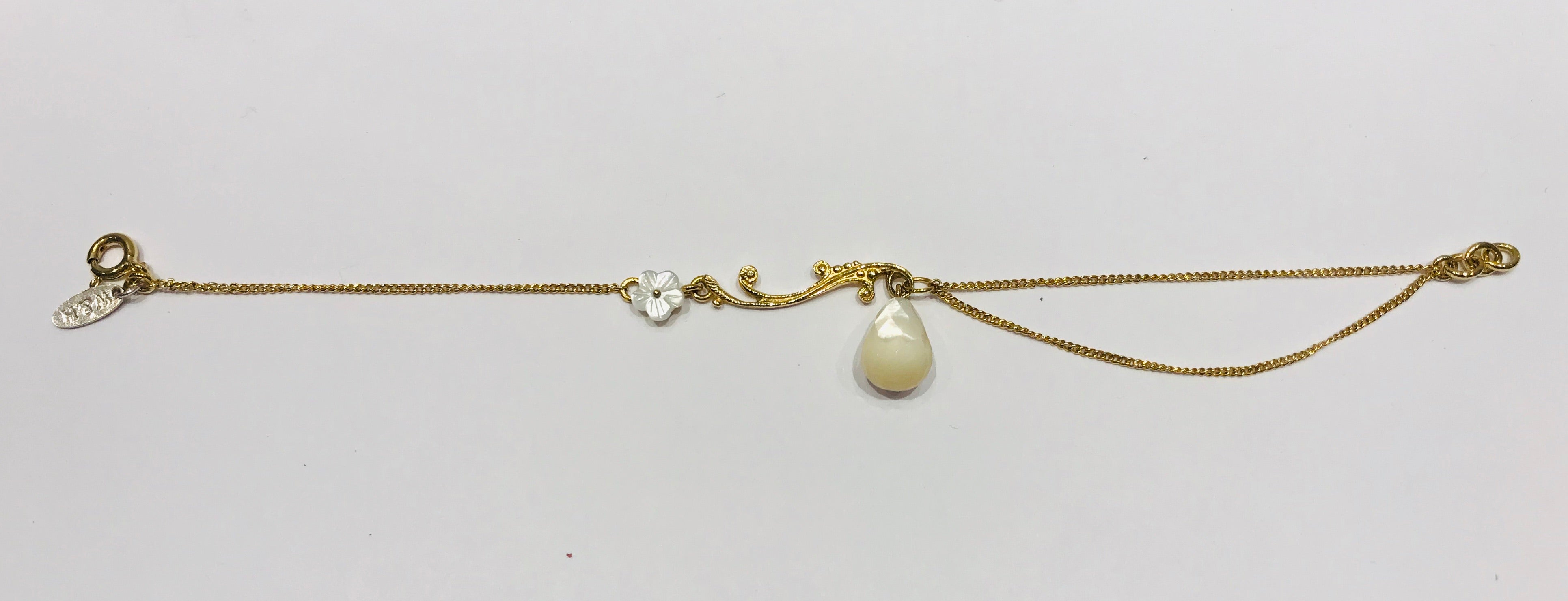 This elegant goldplated silver bracelet has a beautiful crafted piece and a delicate mother of pearl white flower. The faceted drop also in mother of pearl gives the bracelet its subtle glow.