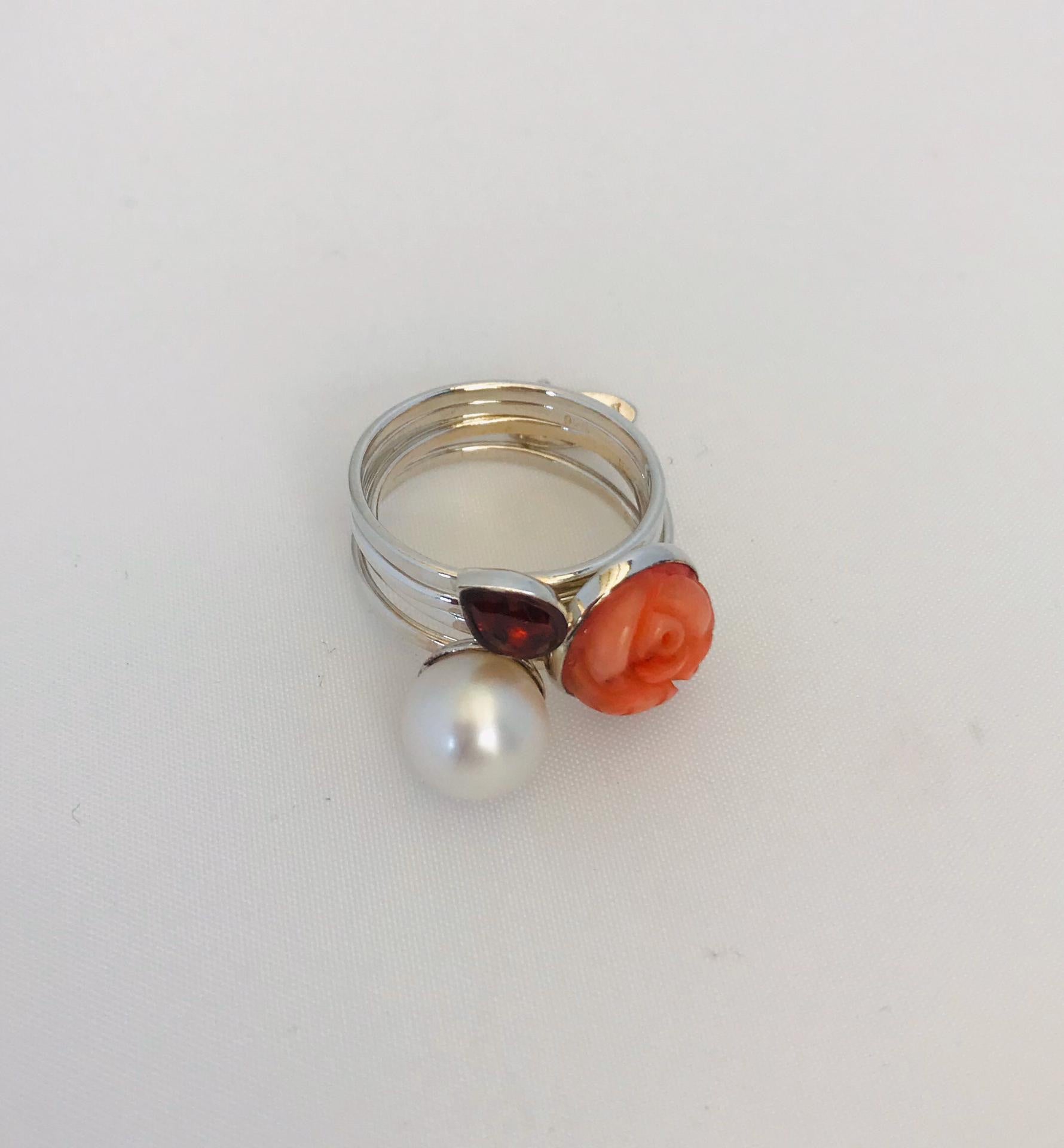 Let your accessories do the talking with this 5 silver mix ring of which 1 garnet stone, 1 pearl and 1 coral by Wouters & Hendrix.