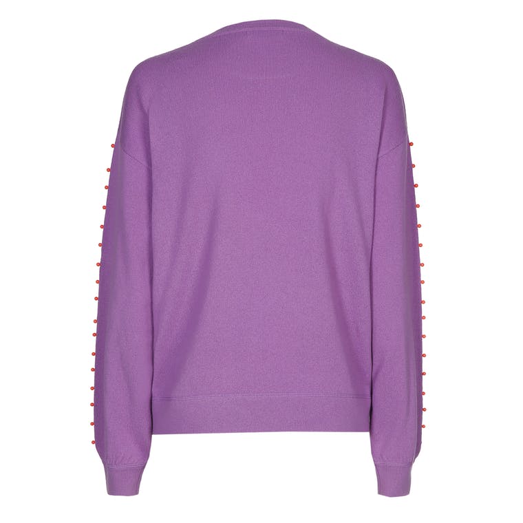Paarse, gebreide trui met oranje decoratie op de mouwen. De trui heeft een ronde hals en is gemaakt in een zomerse wolmix. Hoe paars combineren? Ga voor een mix met oranje, lila, turquoise en lichtblauw.